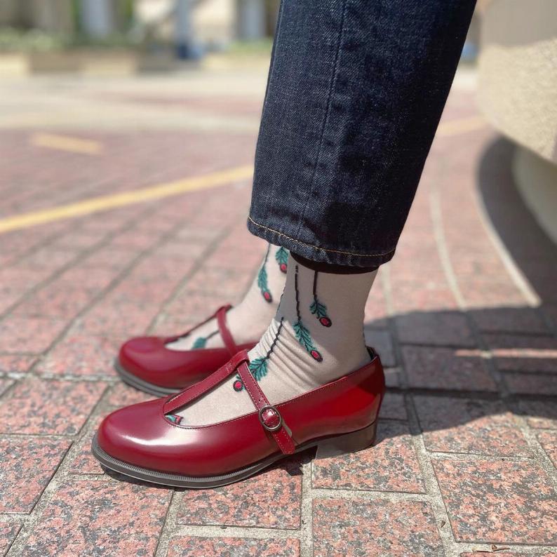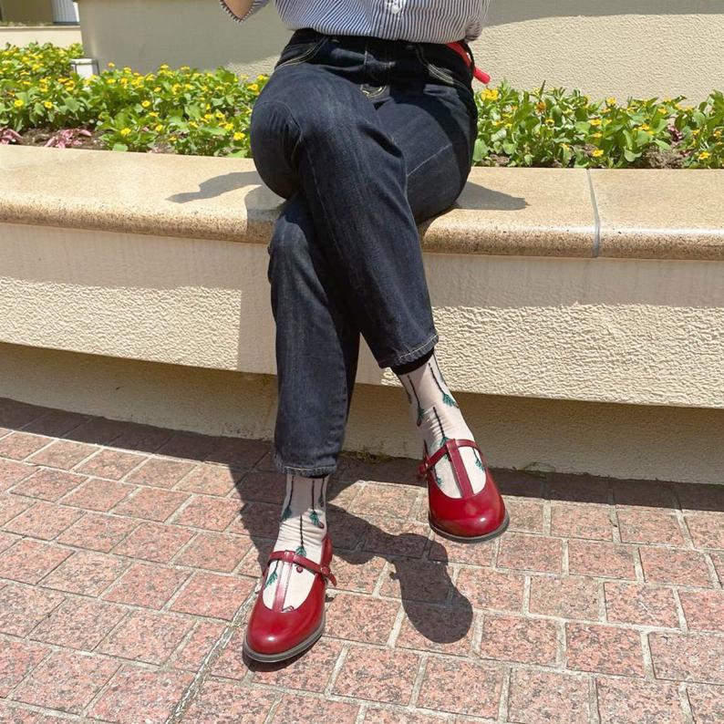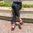 足の甲部分が広めに開いており、丈の長いパンツと合わせてもソックスの色や柄をしっかり見せられるのでコーディネートを工夫するのが楽しいです! 個性的でやや目立つデザインですが、同系色のソックスやストッキングを合わせればシックに落ち着いた雰囲気にもできるので、いろんなシーンでたくさん履けそうです。やや小さめな感じがしたので、サイズに迷ったら大きめを選んだほうが良いかもしれません。